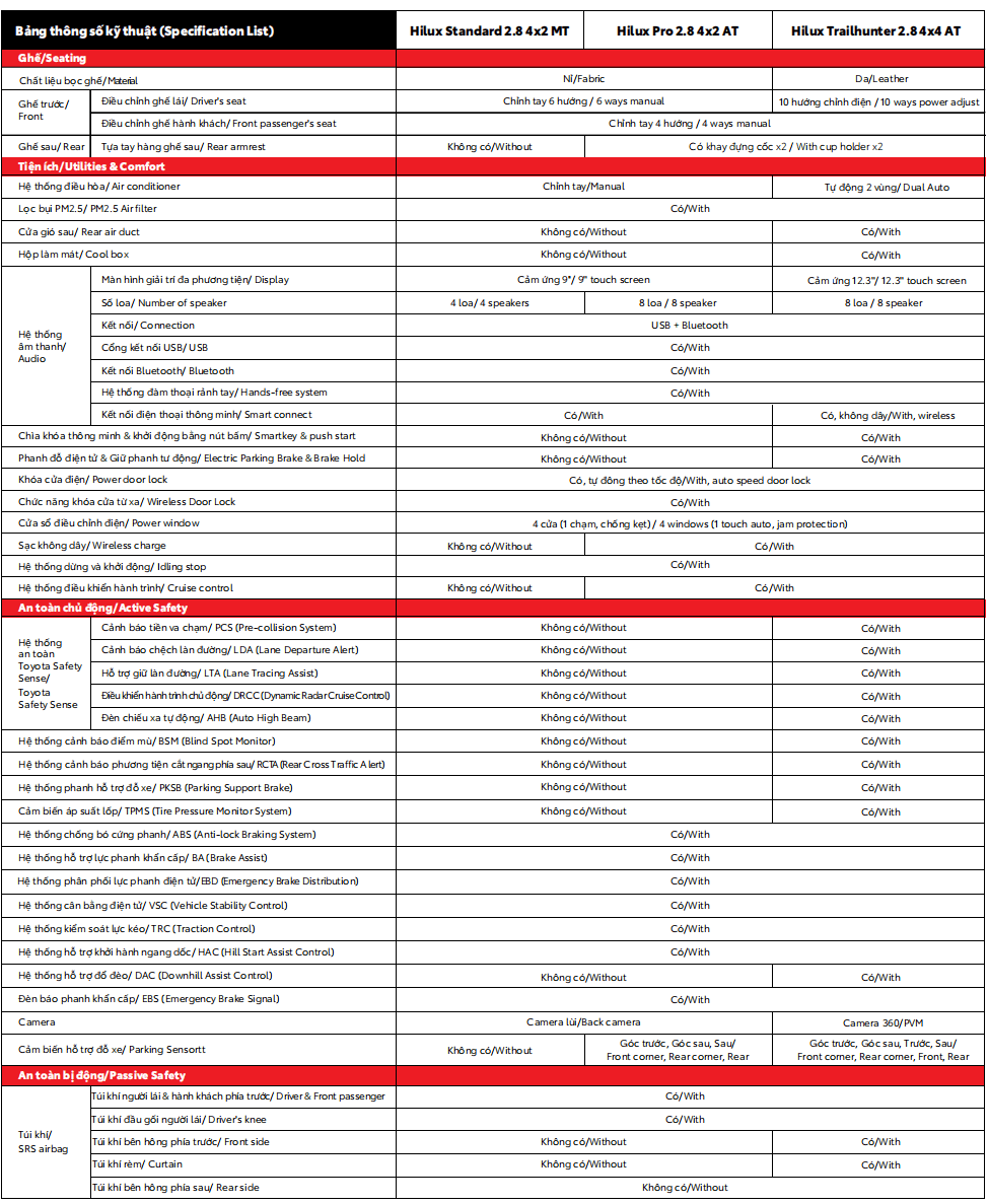 THÔNG SỐ KỸ THUẬT TOYOTA HILUX 2026