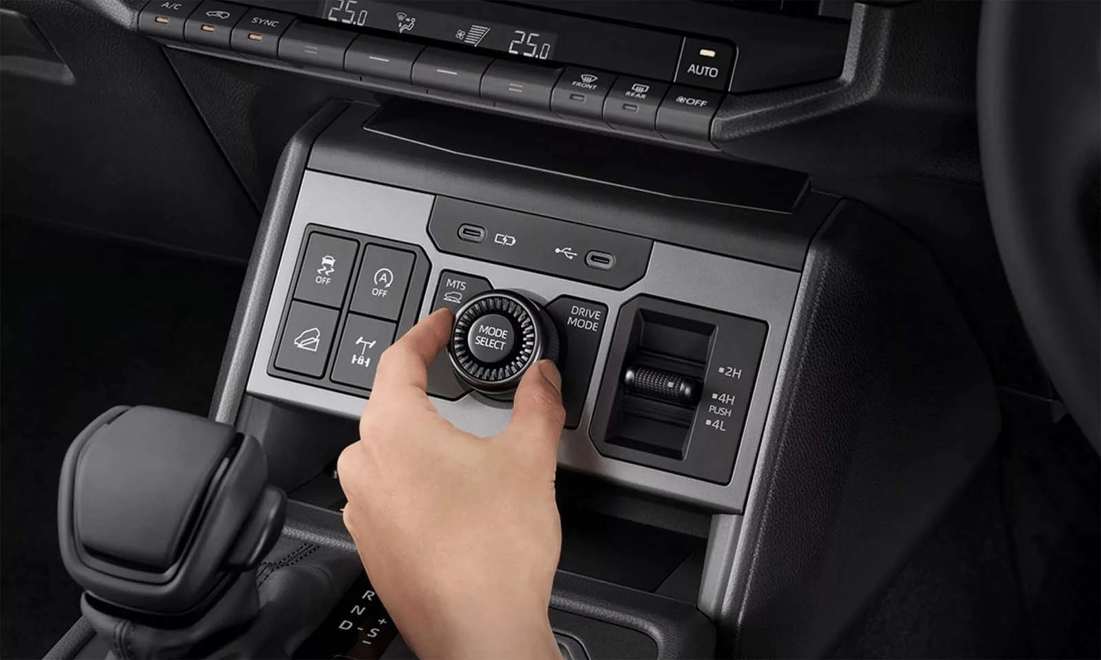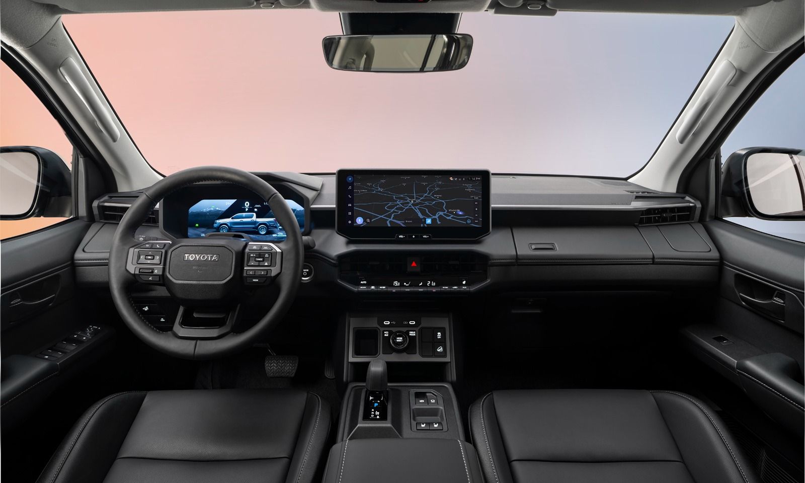 Bên trong khoang lái, Toyota HIlux 2026 có thiết kế hiện đại với màn hình trung tâm kích thước 12,3 inch trên các bản cao và 9 inch trên các bản tiêu chuẩn, tích hợp các chuẩn kết nối điện thoại thông minh hiện nay. Phong cách sắp xếp khu vực yên ngựa và các nút chức năng, kể cả nút vặn gài cầu cũng được thay đổi khá giống chiếc SUV đầu bảng cùng nhà.